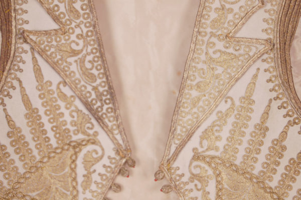 Vest of fine white wool with an attached two part collar, all edged with metallic ribbon and decorated with couched metallic thread in a design incorporating paisley shapes, leaves and flowers. Lined with white silk.