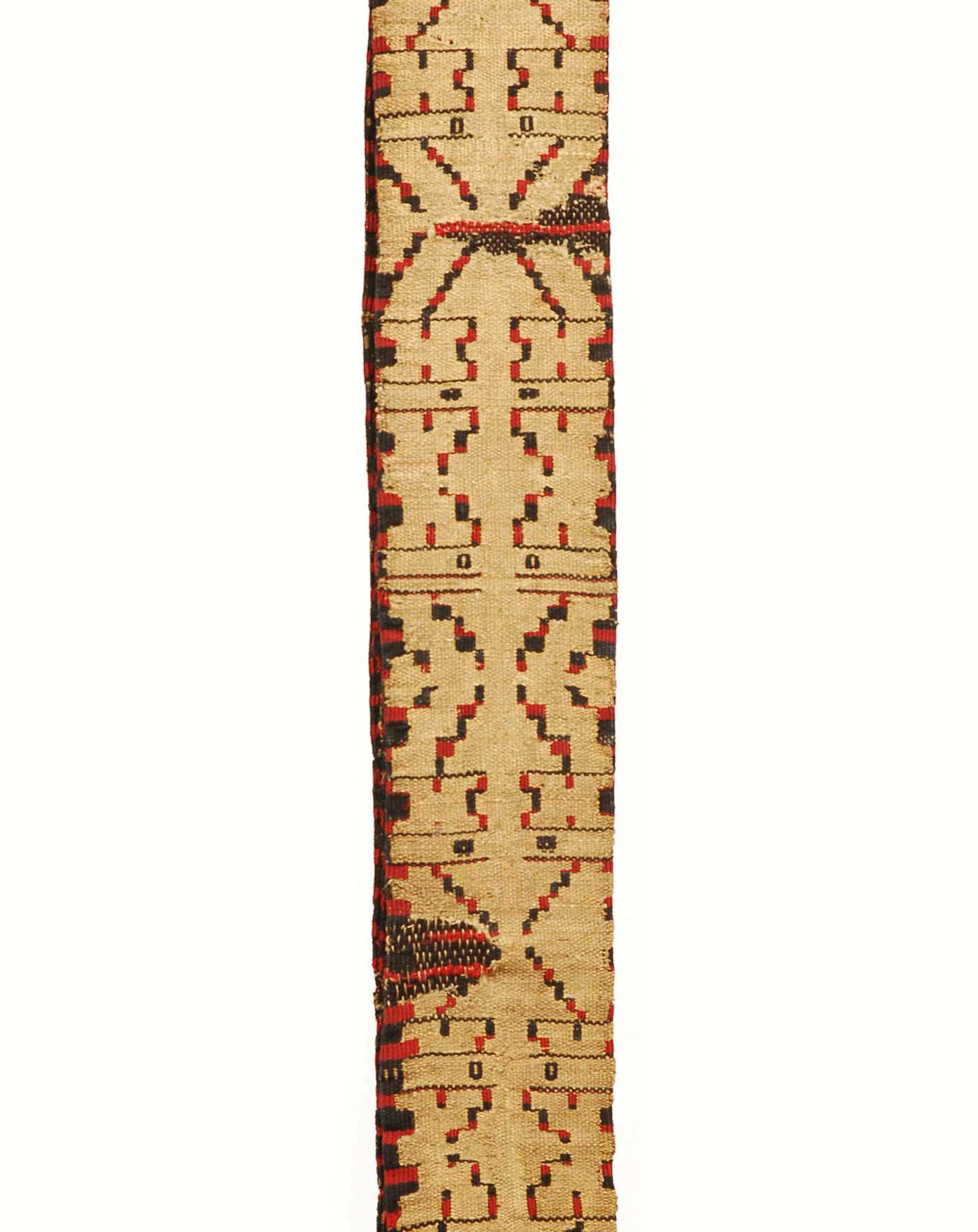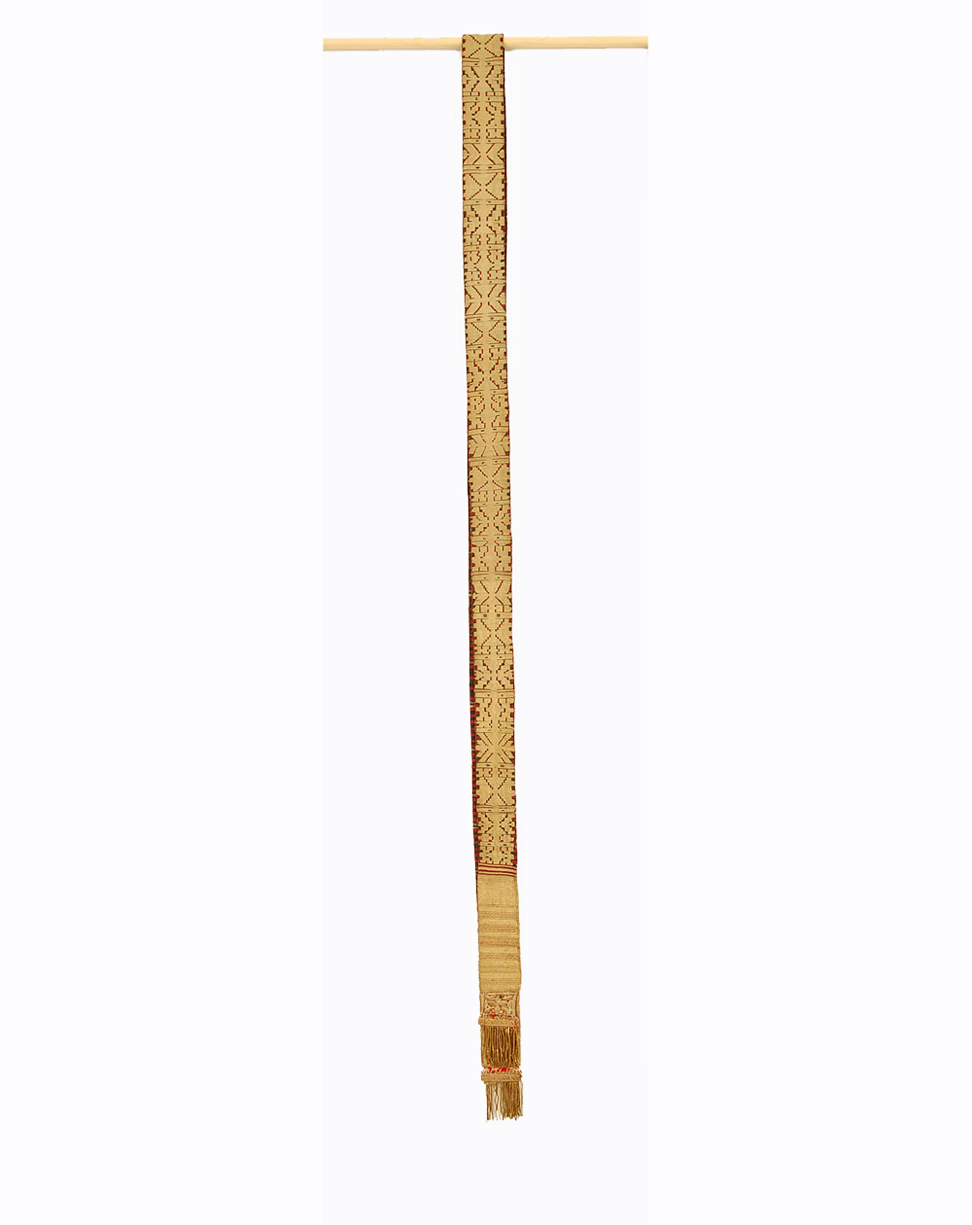 The ends of this waist sash are decorated with red and gold horizontal bands of patterns, panels of red wool trade cloth, and gold tassels. The maker embellished the panels of red trade cloth with gold-wrapped thread and sequins. This belt was likely woven in the village of Solok because it is much narrower than belts woven in other regions. The small pieces of red wool trade cloth inserted into the sash’s end panels is also a common feature of ikek pinggang woven in Solok.
