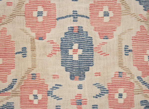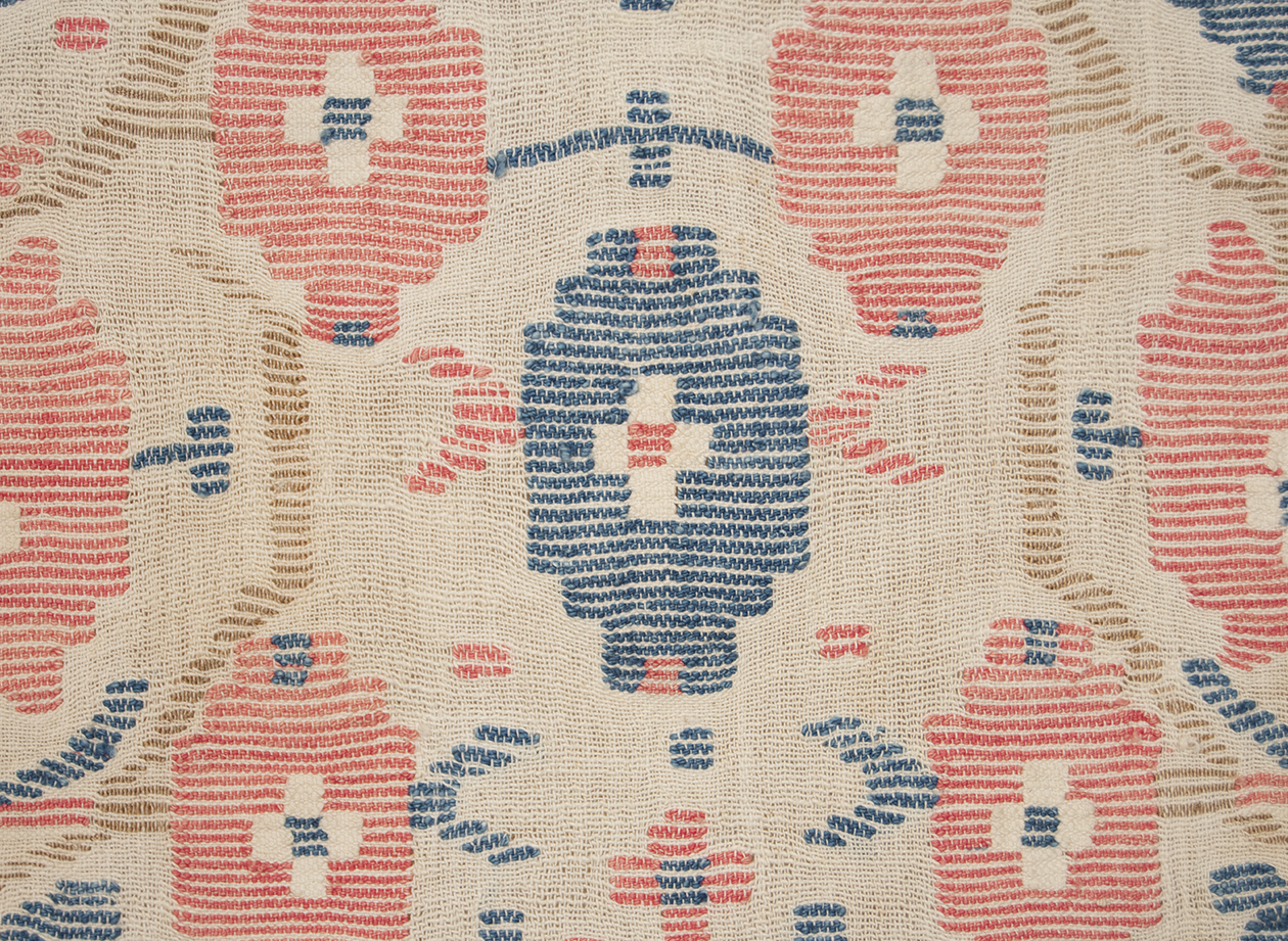 This piece is made of cotton and is a tapestry weave containing geometric and abstracted floral designs at the ends. The ground is an off-white, and the designs are woven in blue, red, and brown.