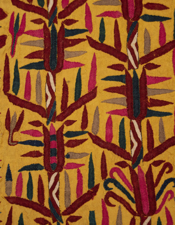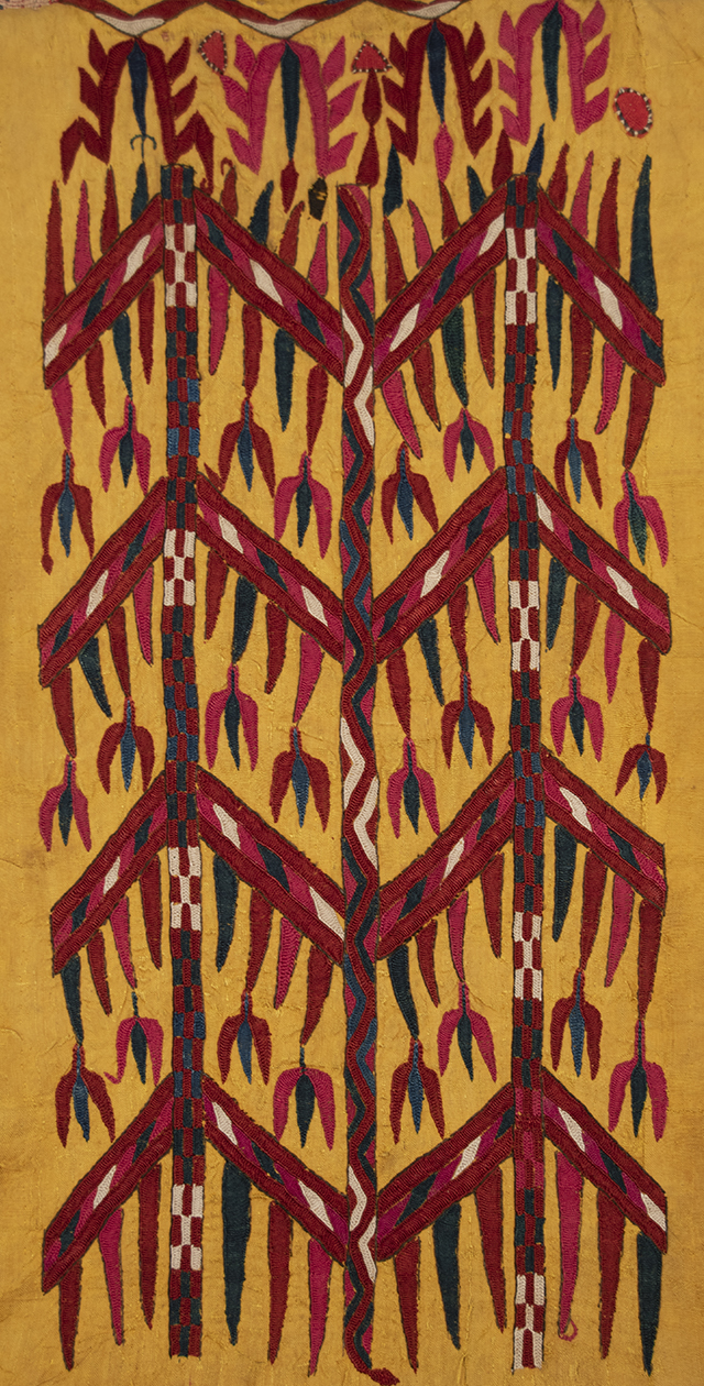 The Tekke is a semi-nomadic tribe in Turkmenistan. Tekke women wear capes (chirpi or chyrpy) over their heads and shoulders like a cloak, with the vestigial sleeves hanging down their backs. Newer chirpis do have usable sleeves. These chirpis are constructed and embroidered by women. The design is usually of abstracted flowers, mostly tulips. It is executed in a lacing stitch called Kesdi. Women wear different colors of chirpi depending on the life stage they’re in. Young women wear dark blue or black, married women wear yellow, and widows wear white.