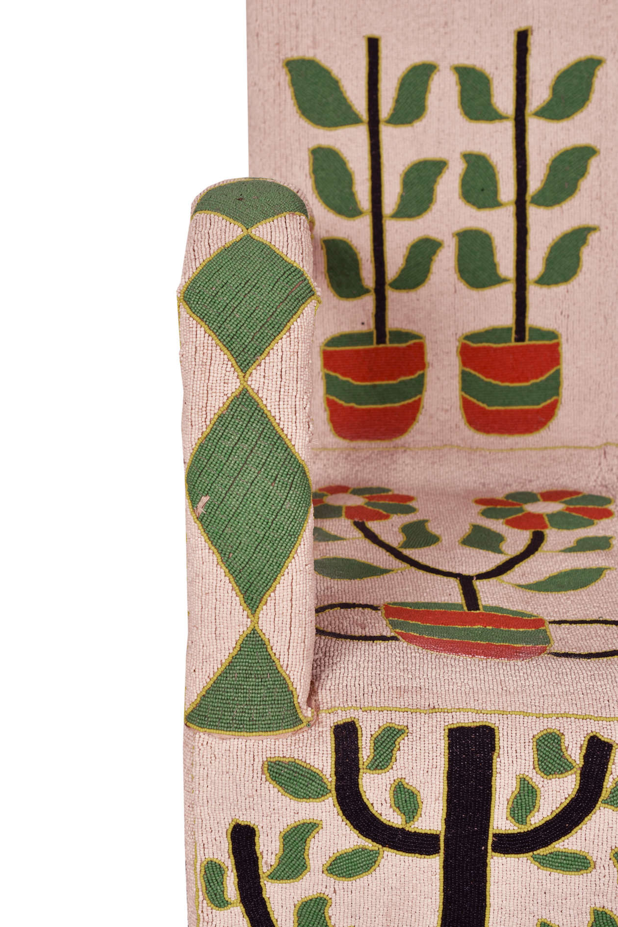 The artist composed a design of potted flowers, trees of life, and geometric lozenge shapes in green, red, black, and yellow glass beads on a background of white glass beads.