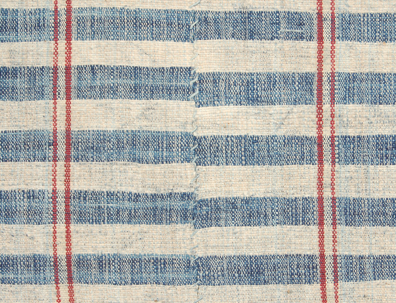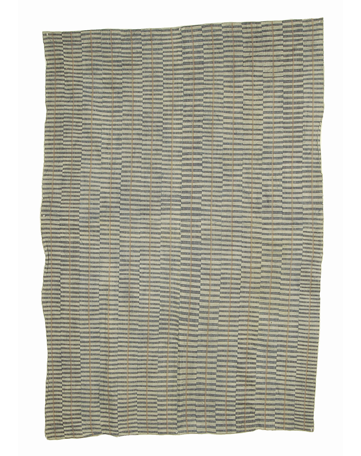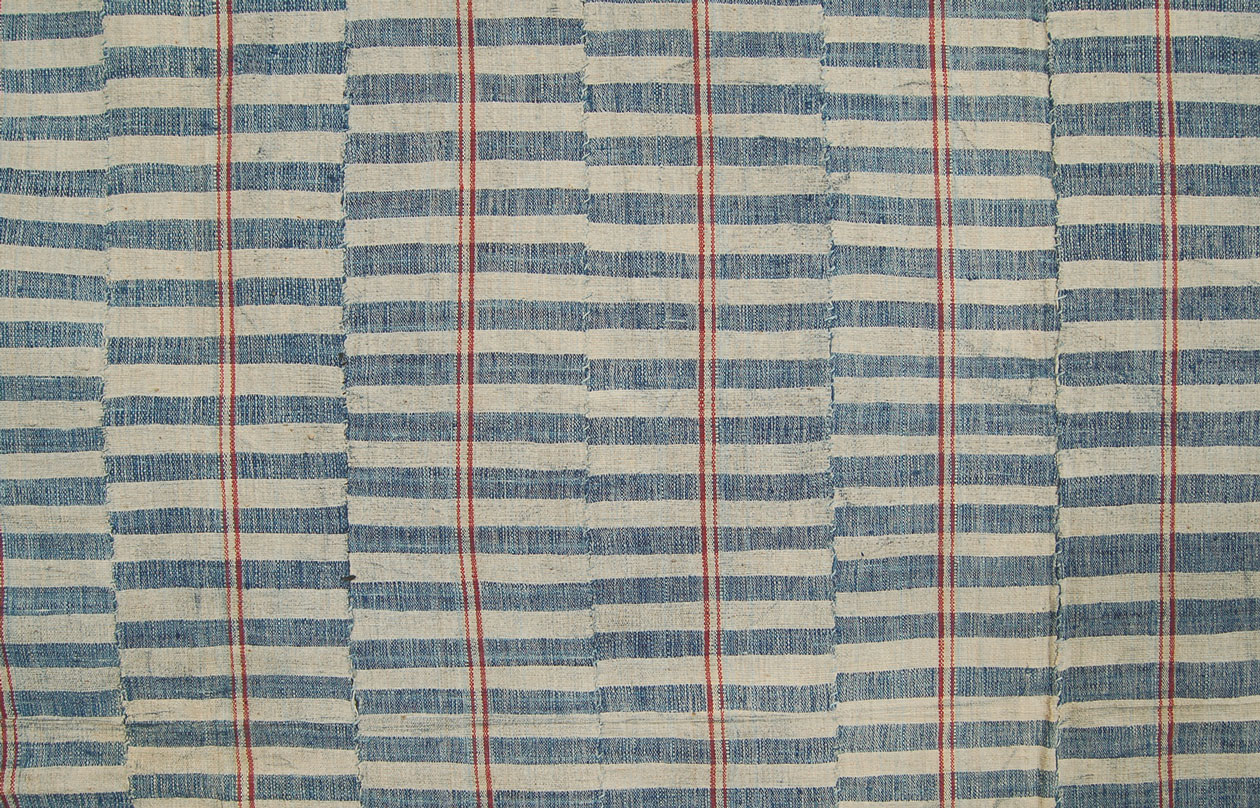 This indigo-dyed blanket was woven by Yoruba textile artists in the early 20th century. It is strip-woven, composed of many strips of blue and white striped cloth, each woven separately on a narrow loom and then sewn together to make a single large textile.